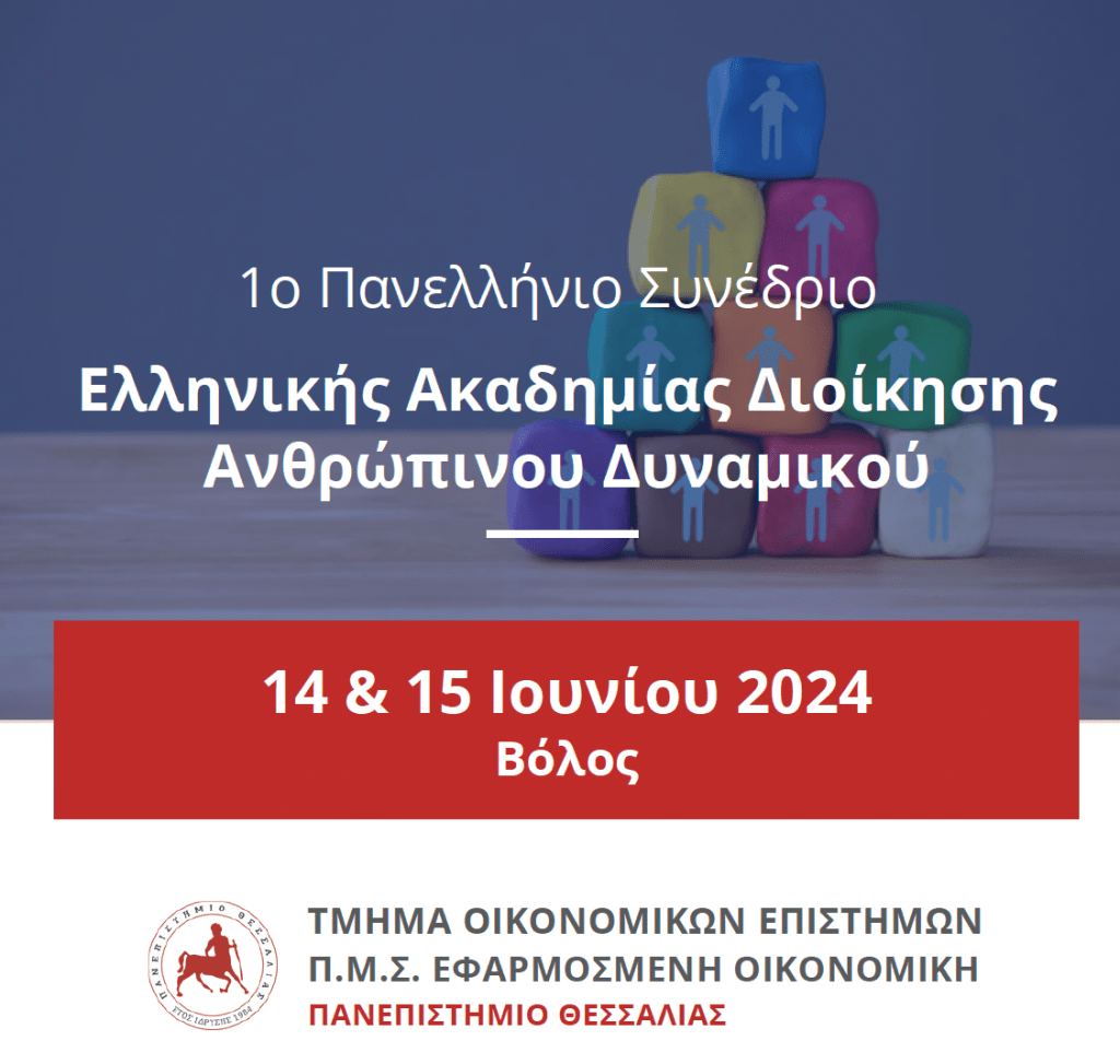 Πραγματοποιήθηκε με επιτυχία στο Τμήμα Οικονομικών Επιστημών, Πανεπιστήμιο Θεσσαλίας στο Βόλο στις 13-14 Ιουνίου 2024, το 1ο Συνέδριο της νεοσύστατης Ελληνικής Ακαδημίας Διοίκησης Ανθρώπινου Δυναμικού (ΕΑΔΑΔ). Στο συνέδριο συμμετείχαν πάνω από 50 πανεπιστημιακοί, ερευνητές και επαγγελματίες της Διοίκησης Ανθρώπινου και πραγματοποιήθηκε σειρά επιστημονικών παρουσιάσεων σχετικών με τη Διοίκηση Ανθρώπινου Δυναμικού, την Οργανωσιακή Συμπεριφορά και την Εργασιακή & Οργανωσιακή Ψυχολογία. Την ευθύνη οργάνωσης και επιτυχούς διεξαγωγής του Συνεδρίου είχε η Καθηγήτρια Διοίκησης Επιχειρήσεων του Πανεπιστημίου Θεσσαλίας Βικτωρία Μπέλλου.